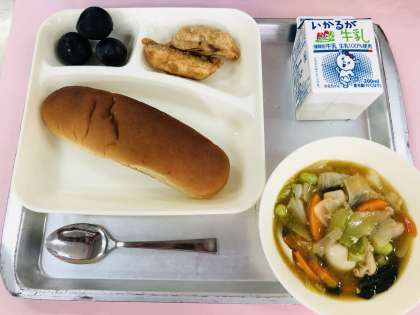 今日の給食は「黒糖パン、あげぎょうざ、中華煮、ぶどう(巨峰)、牛乳」です。