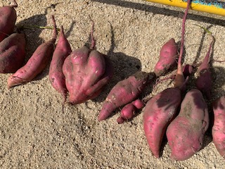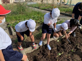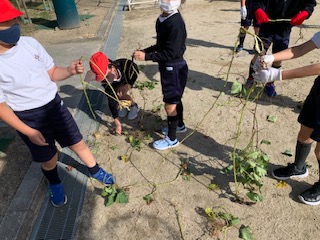 先日いいお天気の中、おいも掘りをしました。春に植えた苗が、つるを長くし、葉をたくさんしげらしていました。みんなで土を掘り起こすと、大きなお芋がたくさん実っていました。長いつるで、なわとびをしました。