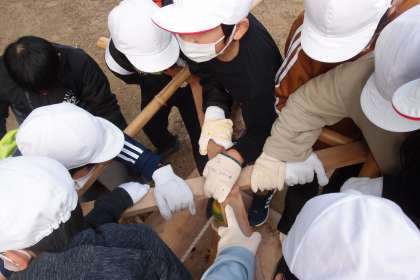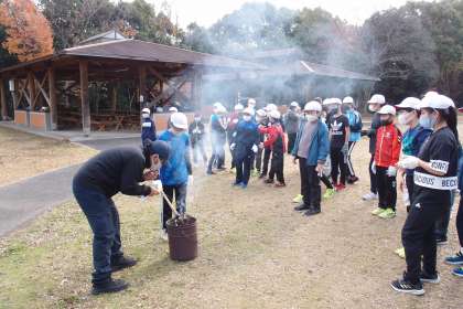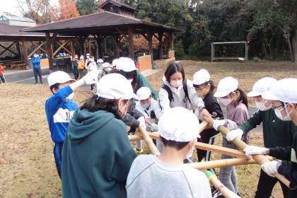 12月10日金曜日、信太山青少年野外活動センターに行ってきました。綱引きをしているようですが、みんなで縄を引いて押して火おこしをしているところです。成功率25%の難しい作業をみんなで協力して行いました。