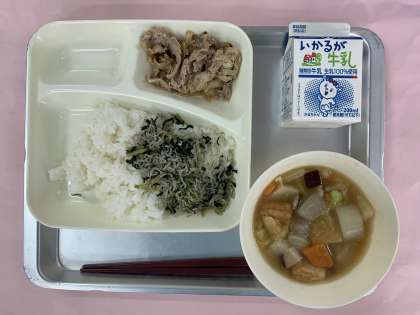 今日の給食は「じゃこ菜っ葉ごはん、豚肉のスタミナ焼き、あつあげと冬野菜のあったか煮、牛乳」です。