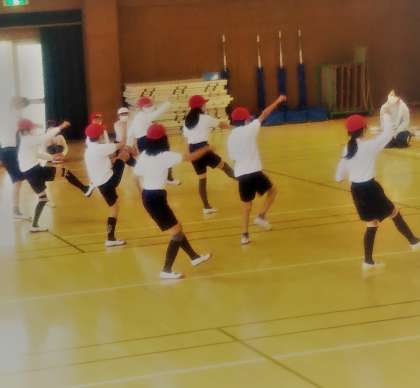 学年で講堂に集まり、リズムダンス発表会を行いました。各クラスごと4グループに分かれ、自分たちで考えた振付で楽しくダンスしました。