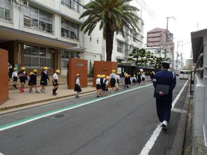 お話の後に、縦割り班で学校周辺を歩きました。6年生の班長を中心に、安全に歩くことができました。