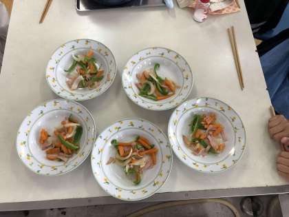いためる調理で『いろどりいため』を作りました。友達と協力しながら、手際よく作業を進め、できた料理をおいしくいただきました。