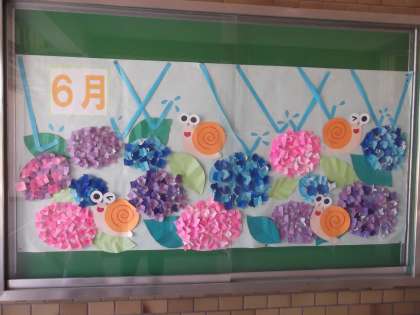 前回の続きにもなりますが、写真は6月の玄関掲示の様子です。毎年6月には玄関にきれいな紫陽花の花が咲きます。しかし、もう6月も終わりますね。梅雨明けが待ち遠しいです。
