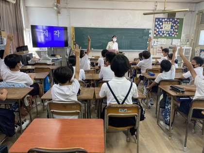 各教室でソンセンニムによる「ハングルに親しもう」の学習を行いました。日本語と発音が似ている韓国語の単語を教えていただいたり、ハングルの読み書きを教えていただいたりしました。