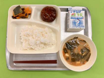 今日の給食は「ごはん、牛乳、和風ハンバーグ、みそ汁、かぼちゃのいとこ煮」です。
