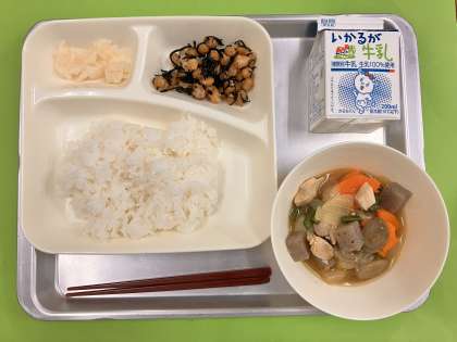 二学期最後のの給食は「ごはん、鶏肉と野菜の煮物、ひじき豆、かぶのゆず風味、牛乳」でした。
