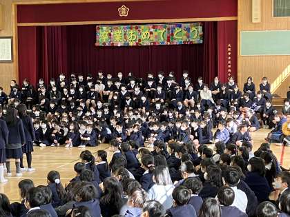 2時間目が1・2・3年生と6年生、3時間目が4・5年生と6年生というように2つのグループに分かれて『卒業を祝う会』を行いました。
