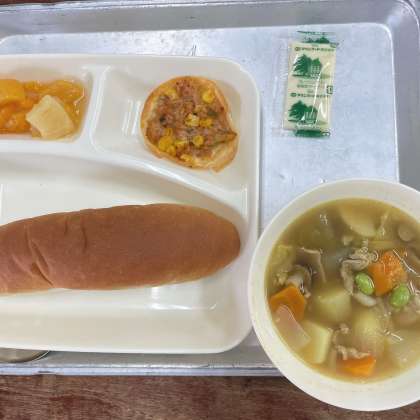 5月2日今日の給食は「豚肉と野菜のカレースープ煮、変わりピザ、ミックスフルーツ(缶)、コッペパン、マーガリン、牛乳」です。