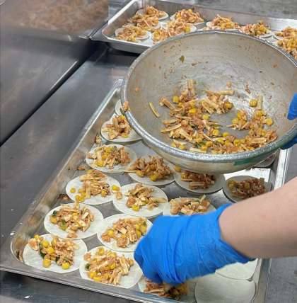 変わりピザは餃子の皮にツナ、コーン、チーズ、ピーマン、ピザソースを混ぜ合わせた具材を乗せて焼く献立です。