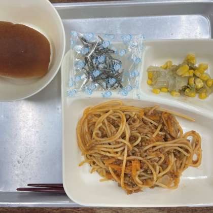 5月10日の給食は「ミートソーススパゲッティ、レタスとコーンのサラダ、ミニフィッシュ、黒糖パン(小)、牛乳」でした。