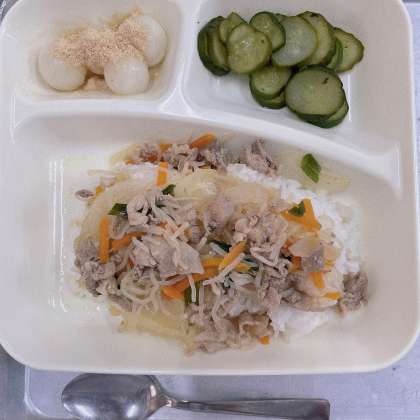 5月23日の給食は「豚丼、きゅうりの梅風味、白玉団子のきな粉がけ、牛乳」でした。