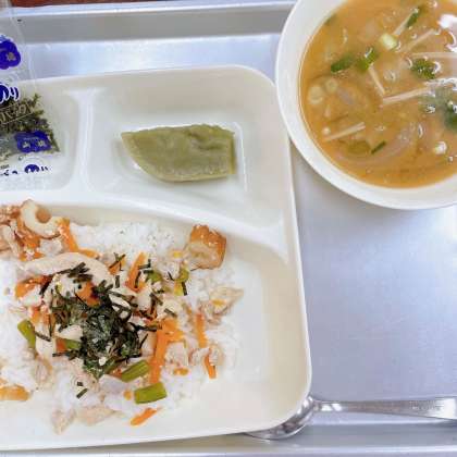 5月25日の給食は「かやくごはん、みそ汁、まっ茶ういろう、牛乳」でした。新茶の季節に合わせて、手作りの「まっ茶ういろう」が登場しました。