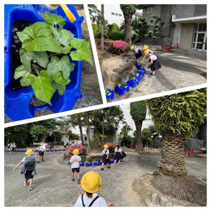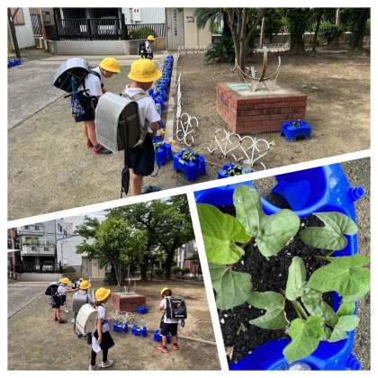 1年生が朝顔に水やりをしています!