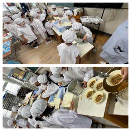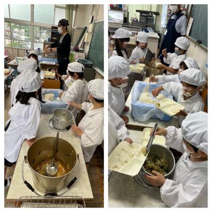 4月は6年生が給食のお手伝いに来て、その姿から当番の仕方を教わりました。