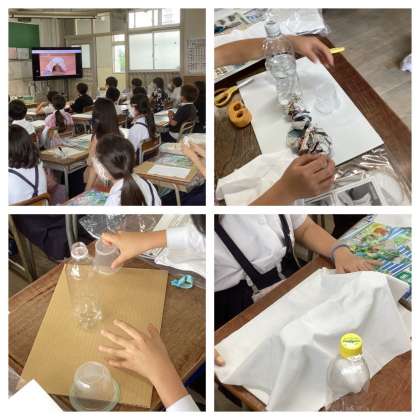 ペットボトルやプリンカップ、新聞紙を使ってどんな土台にしようかと試行錯誤していました。