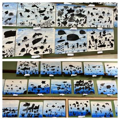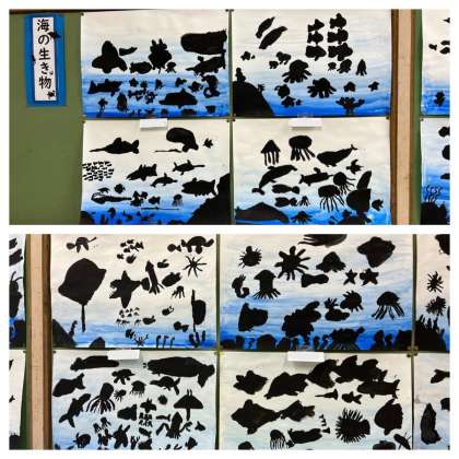 その海を悠々と泳ぐ魚たちは、黒い絵の具でシルエットになっています。