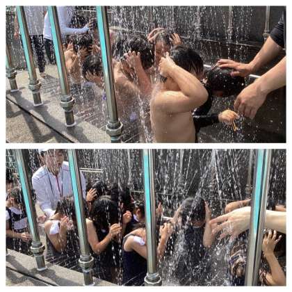 冷たいシャワーの水にもぐっと我慢。頭やおなかをしっかりゴシゴシしていました。