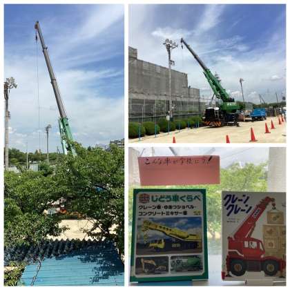 今日は屋体棟の工事のため、クレーン車が運動場に来ていました。