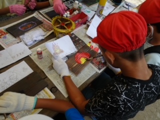 焼いた杉の間伐材の板に、あらかじめ描いておいた下書きを見ながら、絵付けをしました。