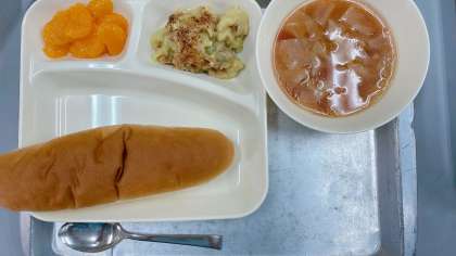 9月4日の給食は「豆乳マカロニグラタン[米粉]、トマトスープ、みかん(缶)、コッペパン、りんごジャム、牛乳」でした。