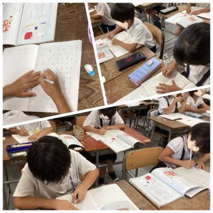 教室のあちらこちらを見渡しては、ノートに書き込む2年生。