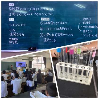 6年 水溶液の性質(10/20) 公開日 2023/10/20 更新日 2023/10/20 6年 「5種類の水溶液は、どうすれば区別することができるのだろうか」 の学習課題のもと、予想を検証するために実験を行いました。 5種類の無色透明の水溶液、実験を通して6年生の見立てた答えは…ばっちり大正解でした!! いいね(0)