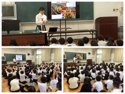 ソンセンニムを迎え、食文化に加え、韓国・朝鮮語での「いただきます」や「ごちそうさま」といったあいさつも教えていただきました。
