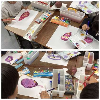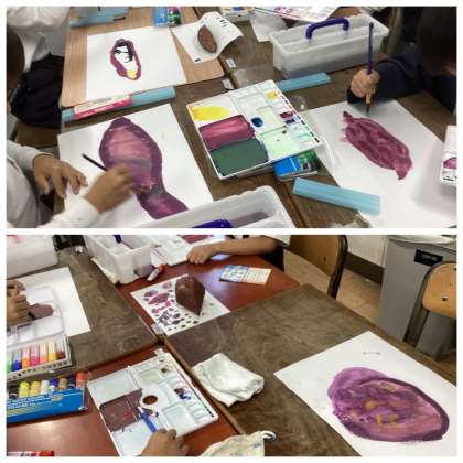2年 観察力に拍手!(10/26) 公開日 2023/10/26 更新日 2023/10/26 2年 収穫したサツマイモの絵を描きました。 その観察力がすばらしい!!形もくぼみもよく見て描いています。 薄い紫色、濃い紫色と考えながら色づけもしていて感心しました。 いいね(0)