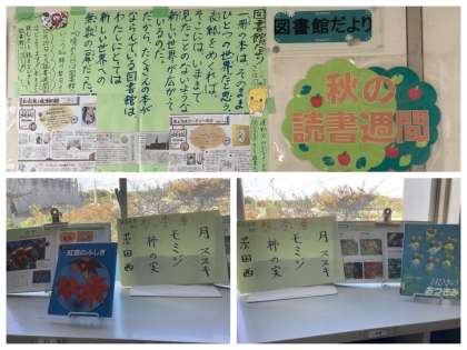 学校の図書室「さくはな図書室」の前には、その月や季節にちなんだ本の紹介やおたよりが掲示されています。「図書室へゴー!!」と読書週間を盛り上げる図書室前でした。