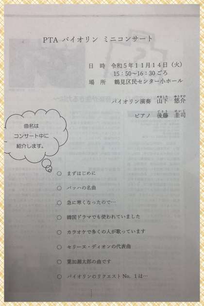 今日の午後3:50からは、PTA の皆さまを対象にバイオリンミニコンサートが開かれます。