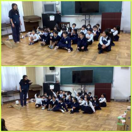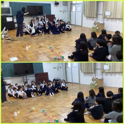 「来年、2年生みたいにできるかな?」の先生の声に「絶対できる!!」と答えた1年生。2年生の姿がよいお手本となりました。