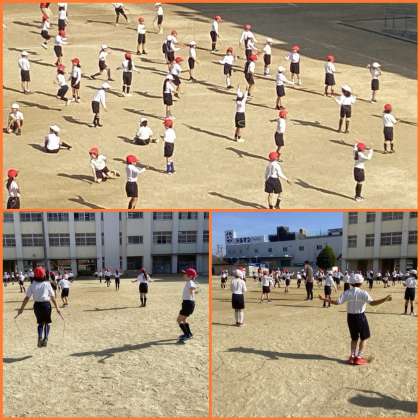 温かい陽ざしのもと2年生が体育科の学習で「なわとび」をしていました。