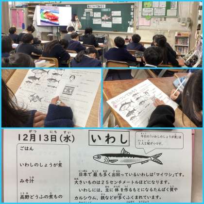 魚のつくりと働きや魚のあぶらの成分など、魚がもつ栄養や身体への効果をたっぷりと学んだので、明日の給食の「いわし」を完食してほしいと思います。