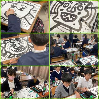 図画工作科では「太陽に顔があったら」という題材で、墨と筆を使って描きました。