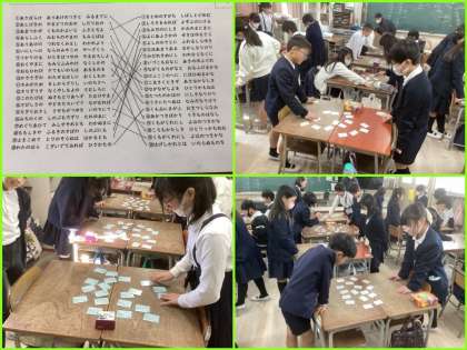 上の句から下の句を選ぶ、百人一首のテストをしました。この1か月、時間があれば百人一首に取り組んだ4年生!!学びの成果を見せるときです!!