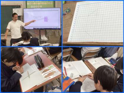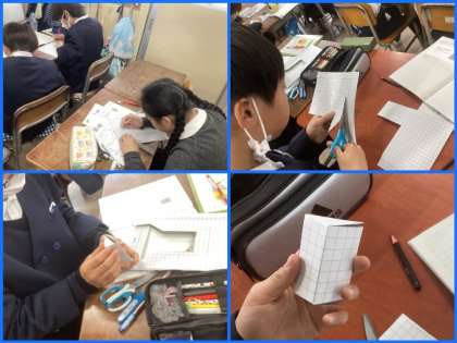 5年 角柱の展開図をかこう(2/19) 公開日 2024/02/19 更新日 2024/02/19 5年 算数科では「角柱と円柱」について学習しています。今日は、三角柱の展開図のかき方について考えました。 底面の三角形のかき方にひと工夫が必要です。方眼紙を前に、真剣に考えていました。 展開図がかけたら実際に切って三角柱を作り、課題を確認することができました。 いいね(0)