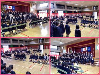 入学式の「お迎えの言葉」の練習も大詰めです。今日は2年生の先輩を迎えて、本番同様に入場から退場まで練習しました。