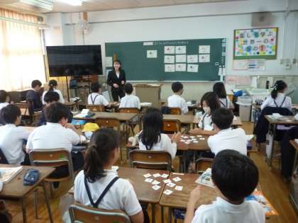 英語で先生とやり取りをしたり、近くの友達と英語ゲームをしたりと