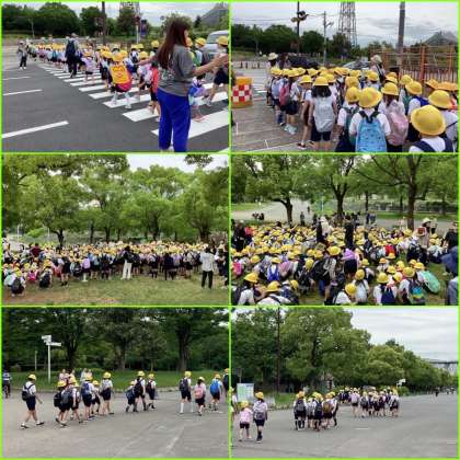 鶴見緑地に到着し、たてわり班でのウォークラリーが始まっています!!