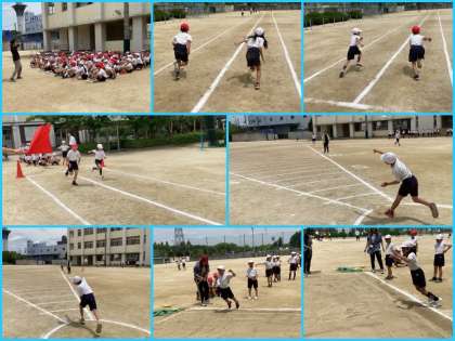 ソフトボール投げでは、担任の先生が50メートル越えの大記録のお手本として見せました。自分たちもあとに続けと言わんばかりに、全身を使って投げていました。