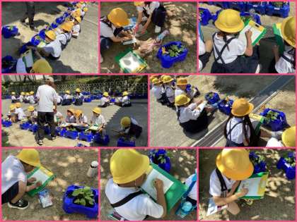 1年生が毎朝しっかり水やりをしているので、あさがおがすくすくと成長しています。ふたばから本葉へと葉がぐんと大きくなっているのを見て、大喜びの1年生。