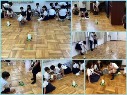風の強弱に気をつけるだけでなく、風の当たり方も考えて実験していました。送風機の風を弱から強へ変えると…車が2メートル以上遠くまで走り、大興奮でした。