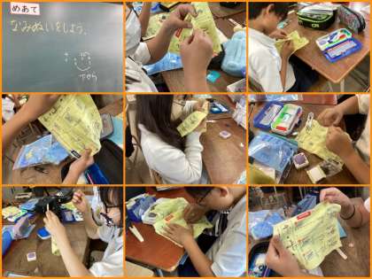 家庭科では『手縫い』の練習をしています。手縫いの基本「なみぬい」を練習しました。