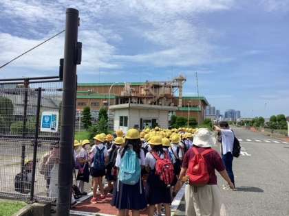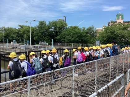 まずは屋外施設の「混和池」や「沈殿池」などを見学しました。暑い中でしたが施設の方の話を熱心に聞くことができました。
