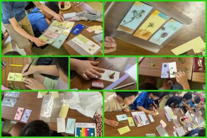 昨日のオリエンテーリングの際に採集した草花を使って、しおり作りをしました。工夫を凝らして作っていました。林間学習の思い出とお土産ができましたね。