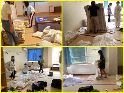 部屋の片づけと掃除をしています。布団の畳み方、シーツを外すものと外さないもの、置く場所など、細々したところで悪戦苦闘中です!!