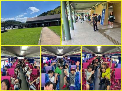子どもたちはバス車内でDVDを見て過ごしています。時折楽しい笑い声も聞こえます。数時間前に山登りをしたとは思えない元気さに5年生のたくましさを感じております。