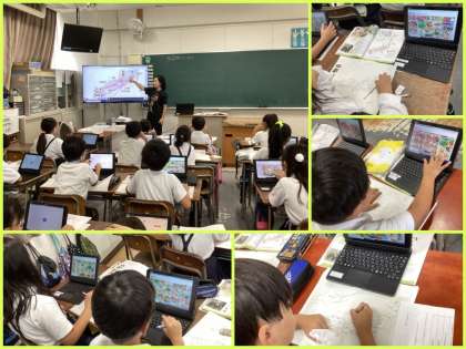 社会科の「店ではたらく人の仕事」の学習では、品物がどこから店に届いているのかを調べる活動をしました。スーパーのチラシを見て、品物がどの都道府県や外国からスーパーに届いているのかを、白地図に書き込んでいきました。白地図に書き込むと…日本全国から品物が届いていることに気づくことができました。