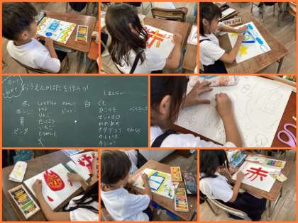 図画工作科では、おうえんのはたを作ります。赤のイメージ、白のイメージを膨らませ、色も考えて描いていました。完成が楽しみです♪